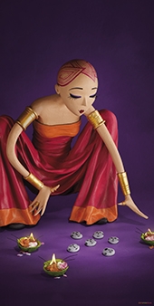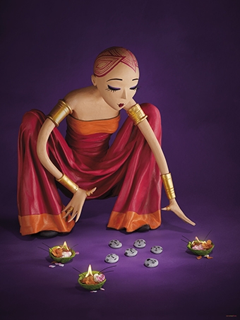 Dans une robe à la fluidité soyeuse, une prêtresse au crâne tatoué d’un motif végétal et aux lourds bracelets d’or procède à un rituel secret. Des galets, des coupelles de pétales enflammés projetant une lumière diffuse l’entourent. L’ambiance mystique et magique ne laisse pourtant transparaître que bienveillance et générosité.